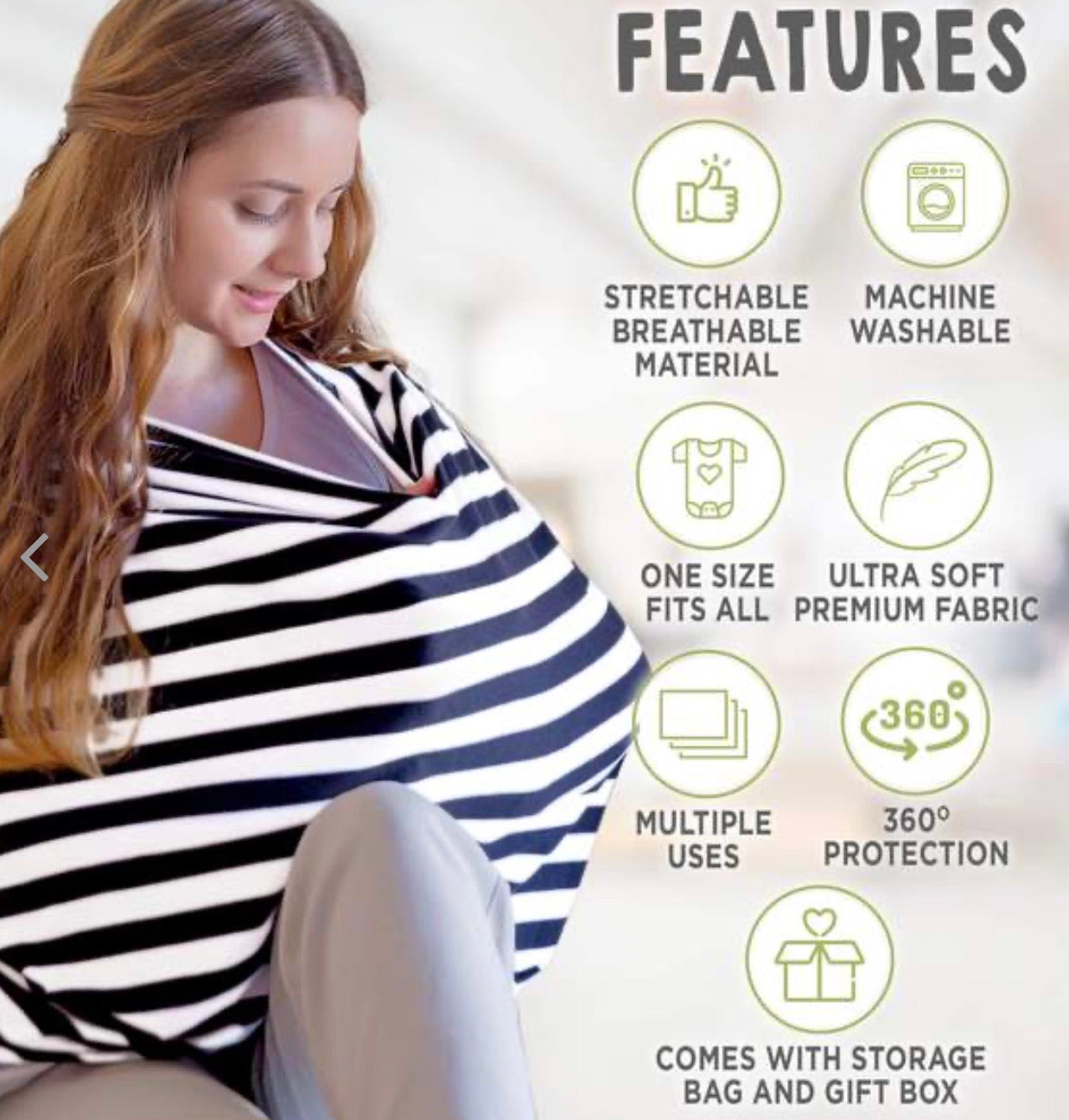 Some uses: Nursing Cover, Car Seat Canopy, Shopping Cart Cover, Baby Blanket, Changing Mat, Infinity Scarf and many more!
